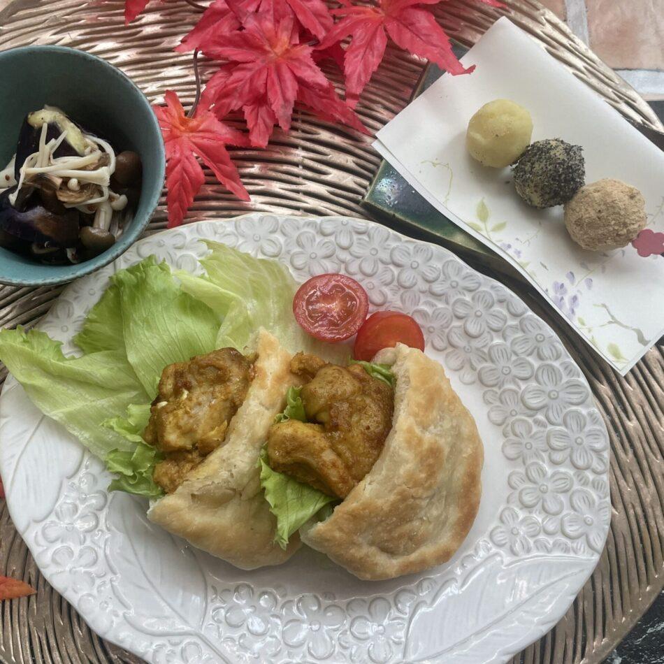 メニューは、ピタパン、キノコと秋野菜たっぷりのマリネ、タンドリーチキンです。