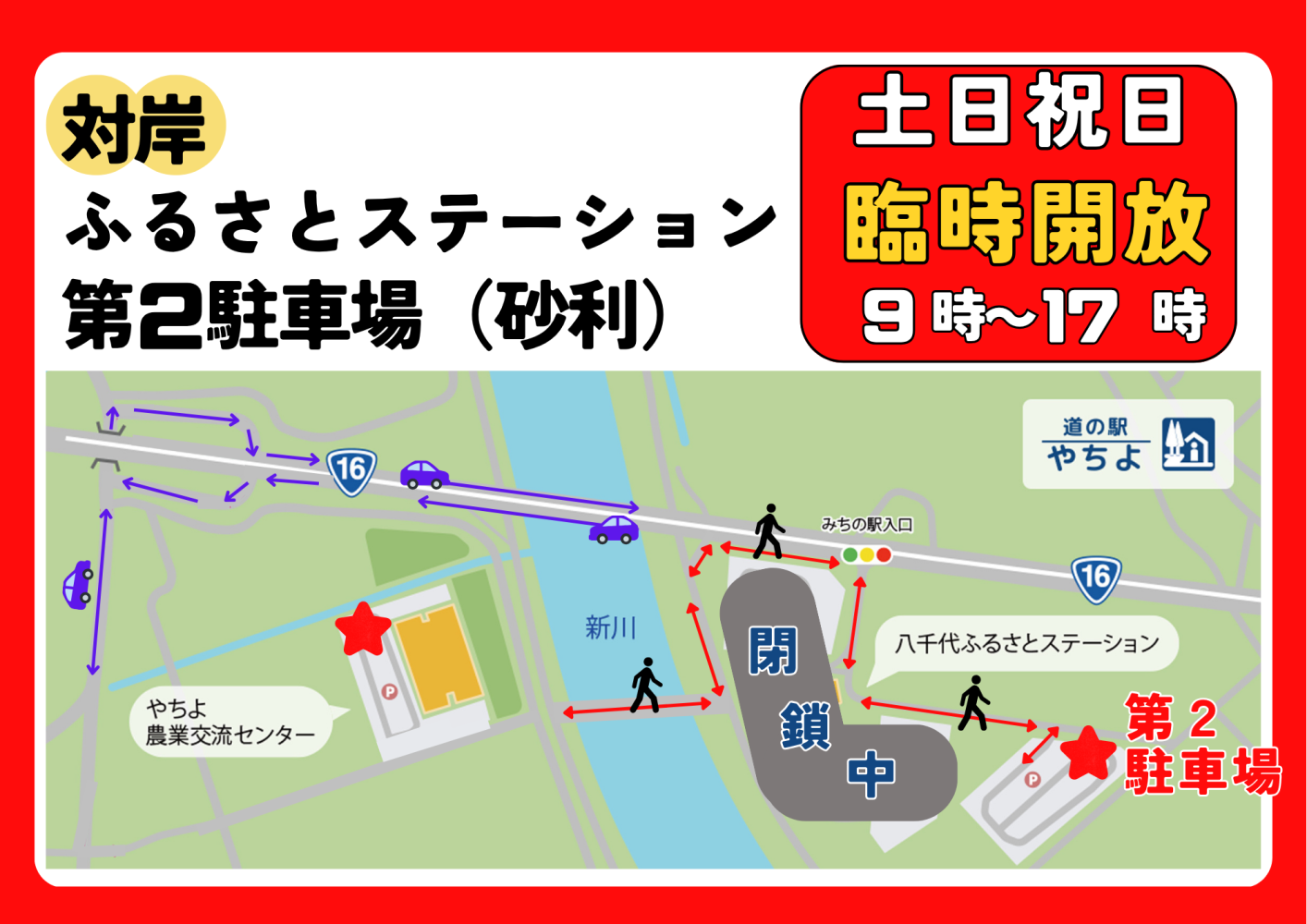 駐車場は、「やちよ農業交流センターの駐車場」をご利用いただきますが、土日祝限定で「ふるさとステーションの第二駐車場」も開放いたします。