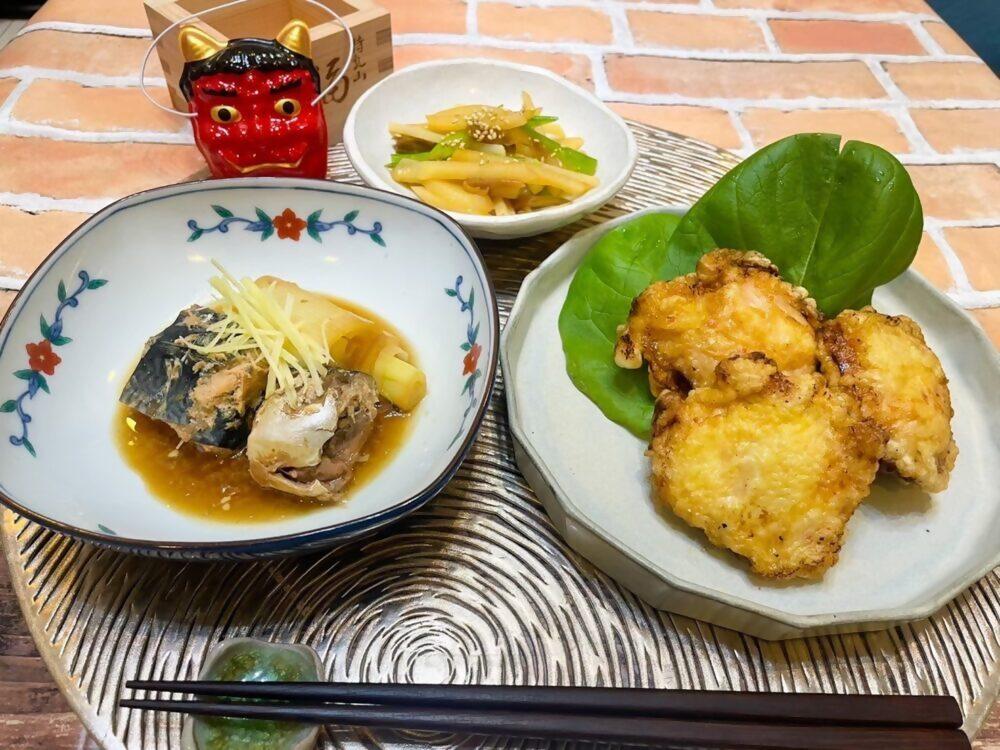 メニューは、ピリ辛とり天、鯖缶を使った味噌煮、ジャガイモとザーサイの和え物です。