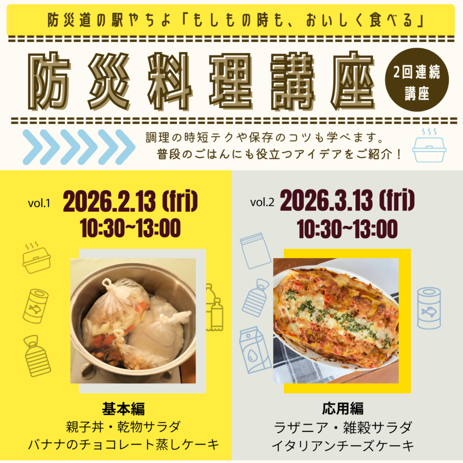 災害時だけでなく普段の食卓にも役立つ防災料理を学ぶ講座です。