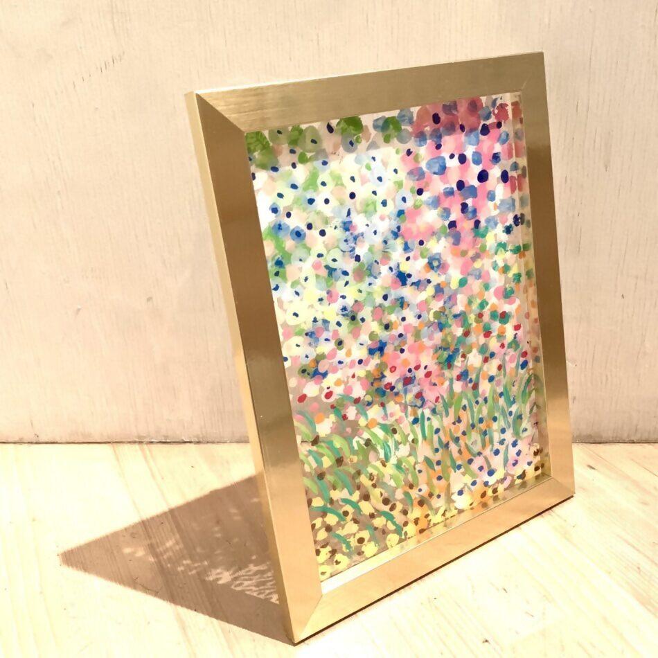 透明なアクリル板に、春の彩りと桜を集めるように色を塗ったり紙を貼ったりしてガラス絵を作ります。