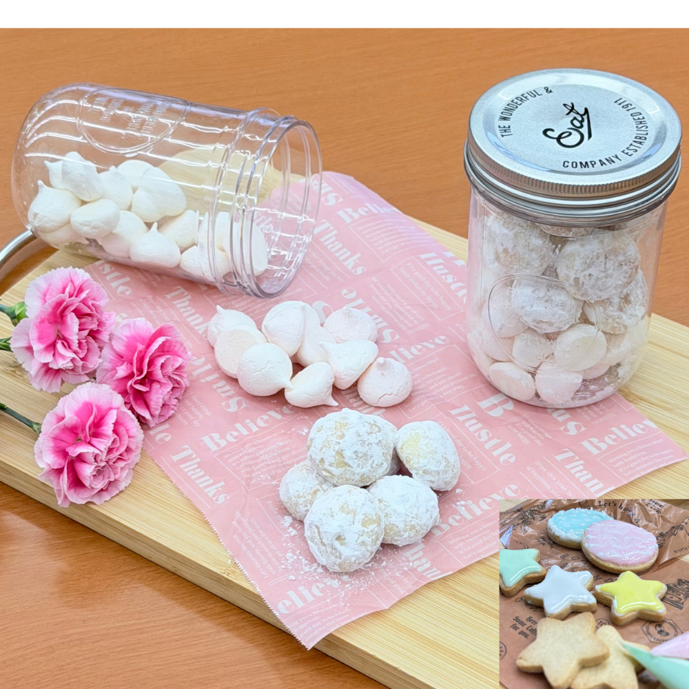 クッキーを作り、アイシングでメッセージを描いてボトルに詰め、母の日のプレゼント用に仕上げます。
